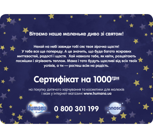 Даний сертифікат дозволяє придбати будь-які товари в інтернет-магазині humana.ua на суму 1000грн!