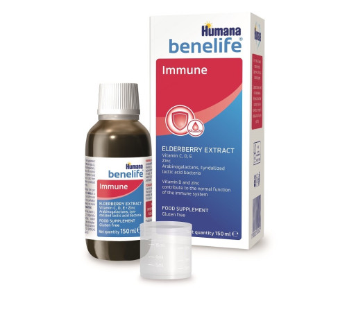 Бенелайф Імуно - за рахунок поєднання чорної бузини (Sambucus nigra L.), вітамінів C, D, E, цинку та арабіногалактанів з модрини ефективно підвищує фізіологічний захист організму та зміцнює імунну систему. Можна використовувати дітям з 12 місяців, старшим дітям та дорослим.Діючі речовини
