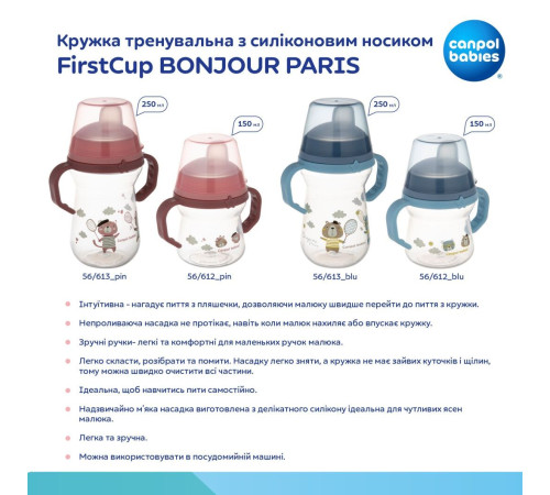 Кружка тренувальна з силіконовим носиком FirstCup від Canpol babies ідеально підходить, щоб навчитись пити самостійно після 6 місяців завдяки носику непроливайці. Носик-непроливайка не протікає навіть, коли малюк нахиляє або впускає кружку. Кружка інтуїтивна, схожа на пиття з пляшечки, дозволяючи швидко та легко перейти з пляшки до кружки. Надзвичайно м'який носик виготовлено з делікатного силікону, безпечного для ніжних ясен малюка. Кружка легка, ергономічної профільованої форми. Зручні ручки дозволяють дитині легко тримати її в маленьких ручках. Невелика кількість елементів дозволяє легко розібрати кружку та помити - кружка не має зайвих куточків і щілин, тому можна швидко очистити всі частини. Носик можна дезінфікувати парою. Кружка тренувальна з силіконовим носиком 150 мл від Canpol babies прозора, що дозволяє контролювати кількість рідини, яку п'є малюк. Кружка тренувальна з силіконовим носиком 150 мл FirstCup BONJOUR PARIS має щільну кришку, яка захищає носик від забруднення. Кружка тренувальна з силіконовим носиком 150 мл FirstCup BONJOUR PARIS від Canpol babies ідеальна для найменших діток від 6 місяців. Доступні змінні насадки.