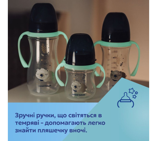 Зручні ручки, що світяться в темряві допомагають легко знайти пляшечку вночі.