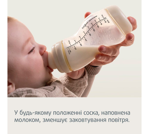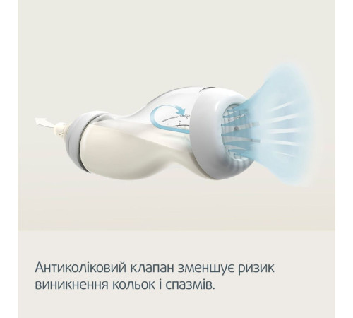 антиколіковим механізмом. Форма пляшечки дозволяє утримувати соску повною
