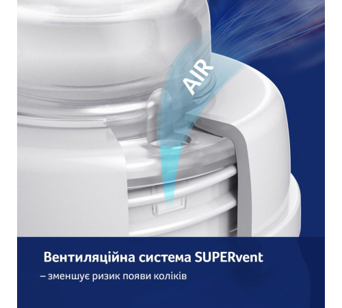 Знижує ризик появи коліків. Вентиляційний клапан захищає соску від всмоктування, що знижує ризик появи коліків.