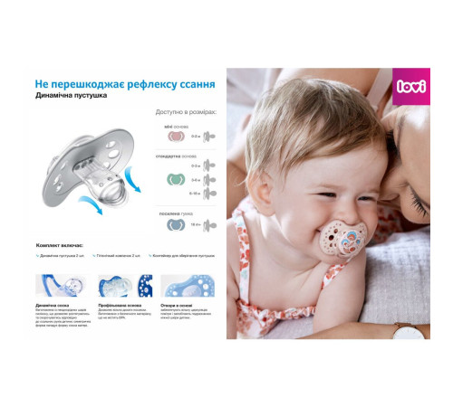 Здорове смоктання. Динамічна форма і унікальна будова пустушки дають можливість дитині вільно дихати через ніс і ковтати слину. Запобігає кусанню пустушки, а також сприяє формуванню правильного прикусу і розвитку мови.