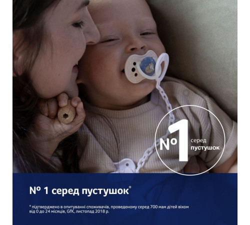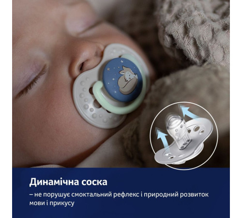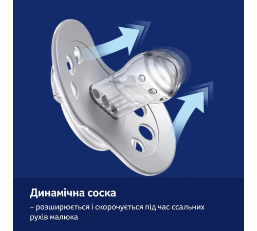 Здорове смоктання. Динамічна форма і унікальна будова пустушки дають можливість дитині вільно дихати через ніс і ковтати слину. Динамічну соску виготовлено з неоднорідних шарів силікону, яка розтягується подібно до маминого соска відповідно до ритму ссання дитини.