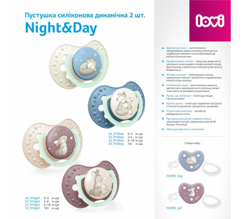 Пустушка силіконова динамічна Night&Day від LOVI - це унікальний мінімалістичний дизайн відповідно до найновіших трендів. Створена фахівцями та лікарями з метою розвитку здорового інстинкту смоктання.