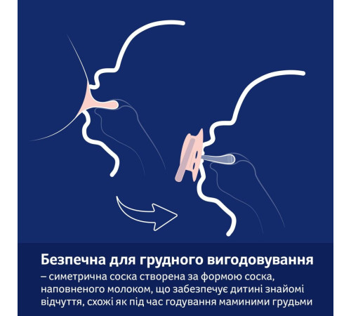 Безпечна для грудного вигодовування - симетрична соска створена за формою соска, наповненого молоком, що забезпечує дитині знайомі відчуття, схожі як під час годування маминими грудьми