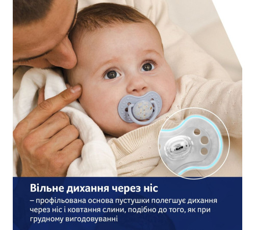 Вільне дихання через ніс - профільована основа пустушки полегшує дихання через ніс і ковтання слини, подібно до того, як при грудному вигодовуванні.