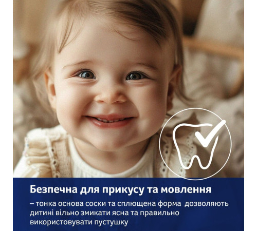 Безпечна для прикусу та мовлення - сплющена форма соски та тонка форма соски дозволяють дитині вільно змикати ясна та правильно використовувати пустушку