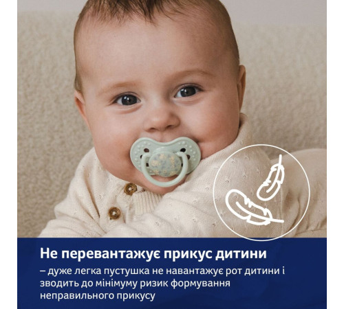 Не перевантажує прикус дитини - дуже легка пустушка не навантажує рот дитини і зводить до мінімуму ризик формування неправильного прикусу.