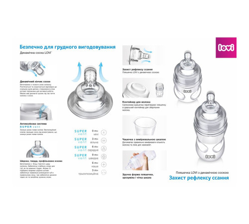 LOVI Trends Пляшечка 120мл Indian Summer - стимулює активне смоктання і дозволяє поєднувати грудне вигодовування з годуванням з пляшечки. У комплекті з пляшечкою додатково: динамічна соска від 3 місяців Динамічна соска виготовлена з неоднорідних шарів силікону. М'який динамічний кінчик виготовлений з більш тонкого шару силікону. Він стискається і розтягується, як мамин сосок, відповідно до природного ритмом смоктання, стимулюючи м'язи ротової порожнини до активної напруженій роботі. Тверде, широку основу соски виготовлено з більш товстого шару силікону, що дає можливість дитині міцно обхопити соску губами. Це сприяє вільному диханню через ніс і запобігає інстинктивне кусання. Профільована форма і підібрана лікарями ширина підстави забезпечує широке розташування губ дитини в правильному місці. Соска оснащена поліпшеною антиколиковой системою виходу повітря що не дозволяє йому змішується з їжею під час годування. Унікальні властивості пляшечки LOVI підтверджені медичними випробуваннями : збереження ритму смоктання відповідна правильна координація смоктання-ковтання-дихання активна робота м'язів губ і язика ефективність смоктання. Не містить Бісфенол-А. Від народження.Відгуки
