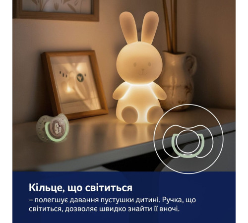формування неправильного прикусу і вимови. Пустушка має ручку, що світиться,