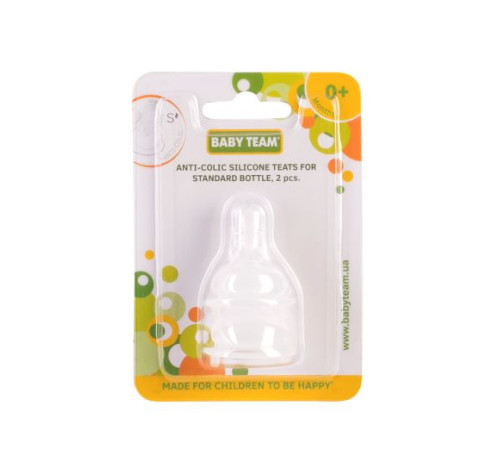Соски антиколікові маленького розміру, повільний потік, використовуються при годуванні дітей від народження, оптимальні для молока, молочних сумішей, чаю, води.Підходять до всіх стандартних дитячих пляшок. Максимально імітують природний процес смоктання. Спеціальна форма соски зменшує вірогідність виникнення коліків. Соски Baby team виготовлені з високоякісних і безпечних матеріалів, а також не містять шкідливих речовин.Матеріал: силікон