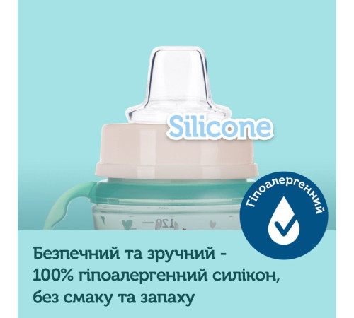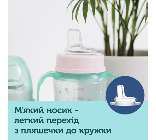 Кружка укомплектована м'яким силіконовим носиком для малюків від 6 місяців. Крім того, до поїльника підходять м'які або тверді непроливаючі носики (призначені для кружок з широким отвором). Будь-який з цих носиків можна придбати додатково, при необхідності.